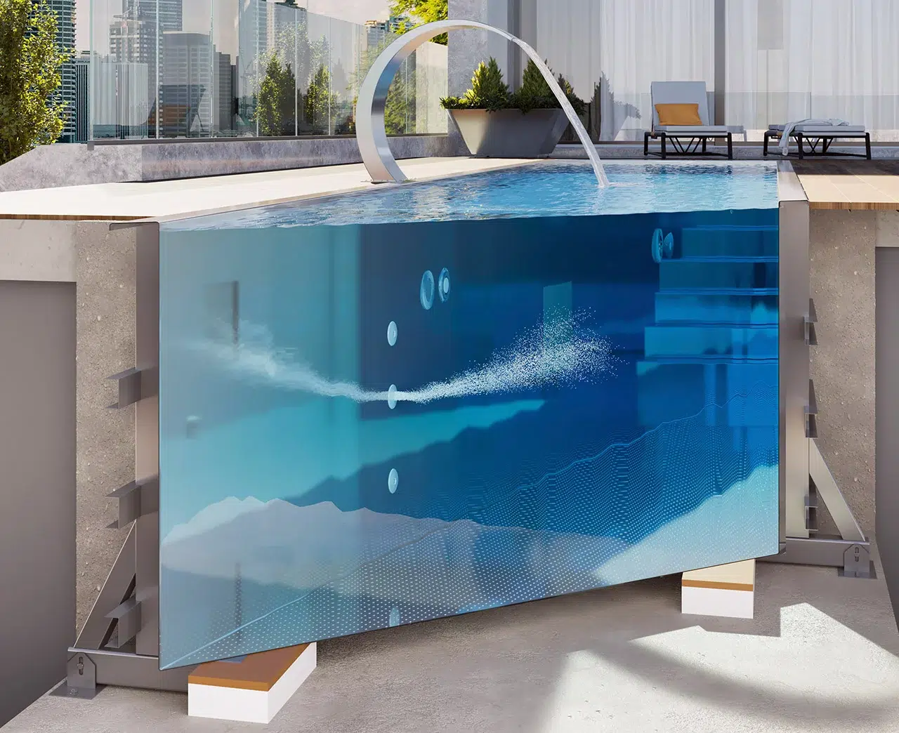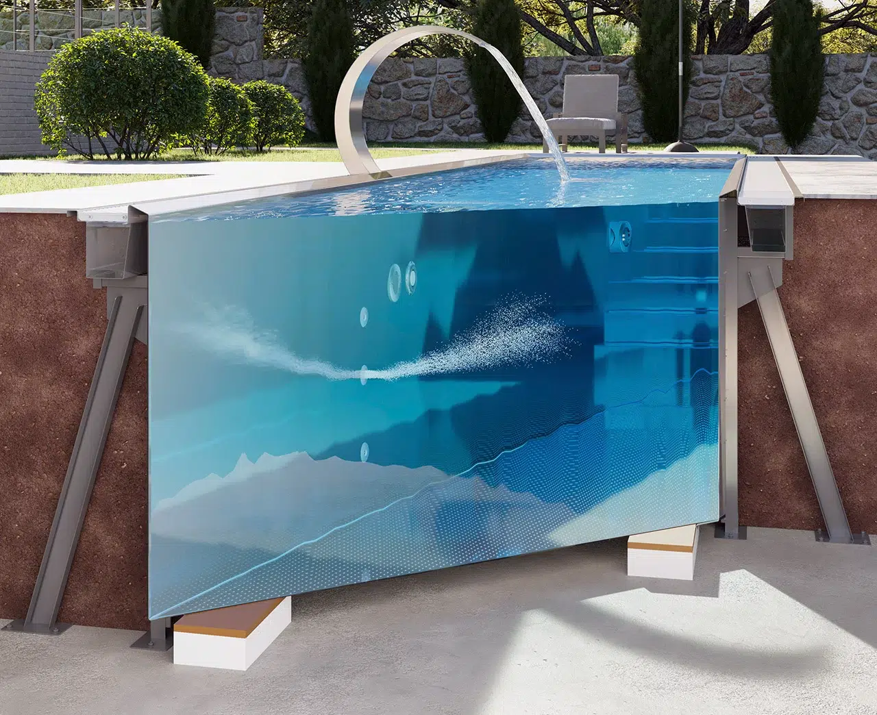 Stainless steel pools are the only pools that do not require any structural support. Only a foundation slab or a foundation strip is required to set up or anchor the pool. The advantage of the self-supporting variant is the short construction time and the low number of interfaces in the entire pool project. In the self-supporting version, however, more stainless steel material is used for the static load-bearing capacity in the form of reinforcements at the rear of the pool and inclined supports against the pool. This is why this variant is the more expensive in terms of pool price. In the overall view of the project, however, the difference is minimized as the construction work still has to be added.