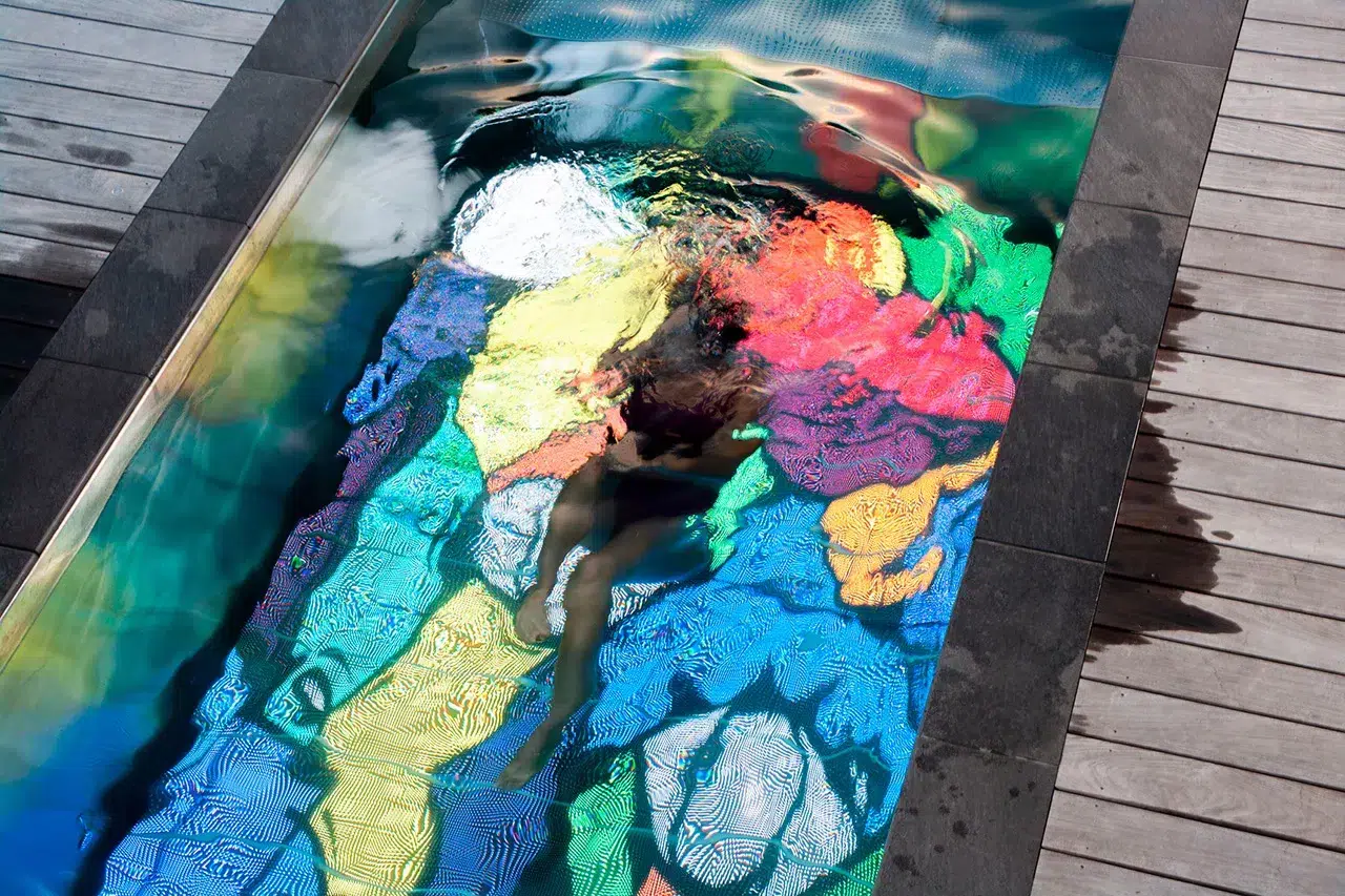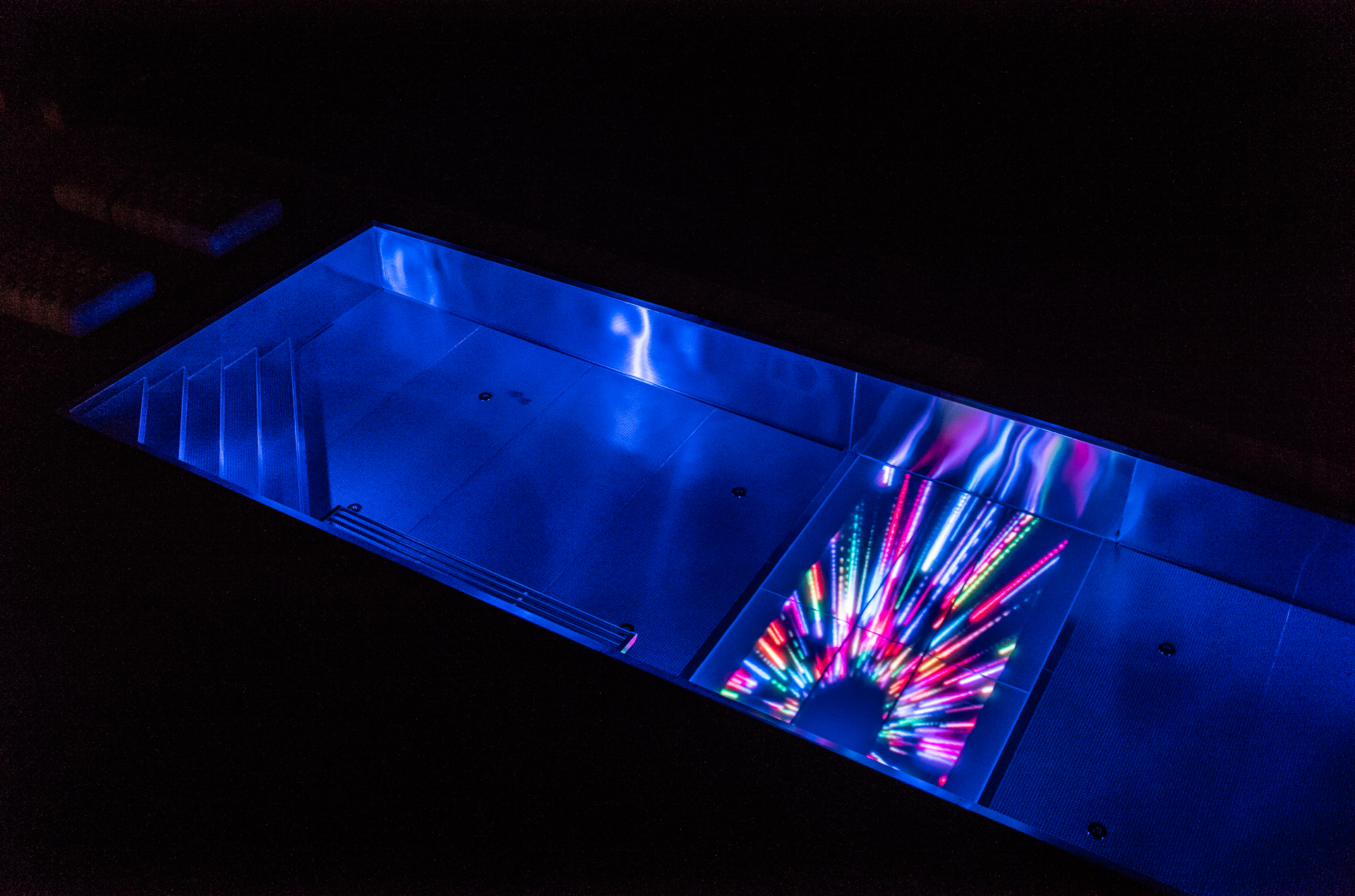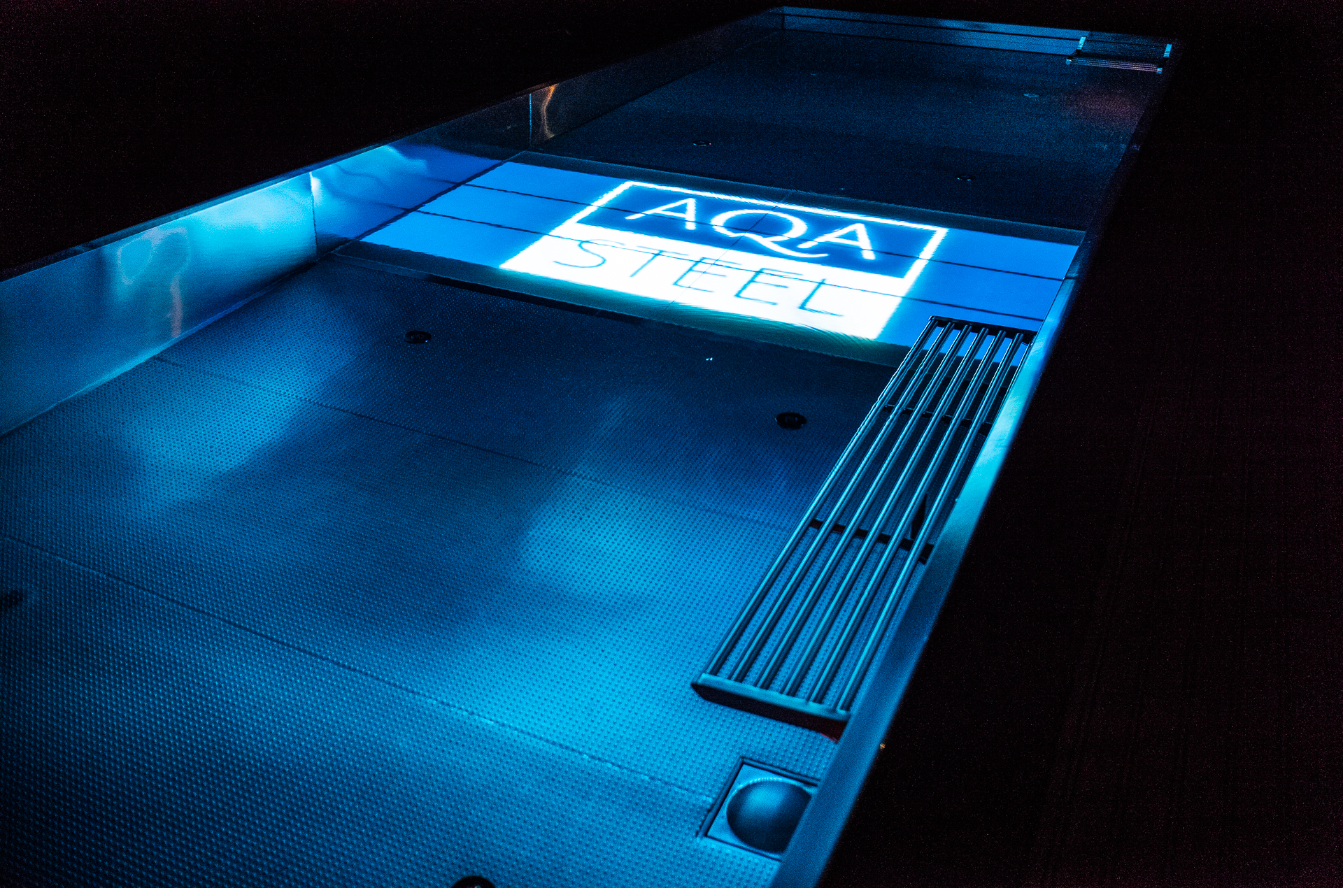 La «Piscina Multimedia» de Aqa Steel, en Perchtoldsdorf, cerca de Viena, recibió un premio. Con la «piscina multimedia» de Aqa Steel, las imágenes corren por el suelo de la piscina. Es de cristal y hace las veces de pantalla. Podrá contemplar la vida marina en movimiento, la emocionante final de la Liga de Campeones o simplemente ver imágenes mientras se baña y nada, en todo el fondo de la piscina.